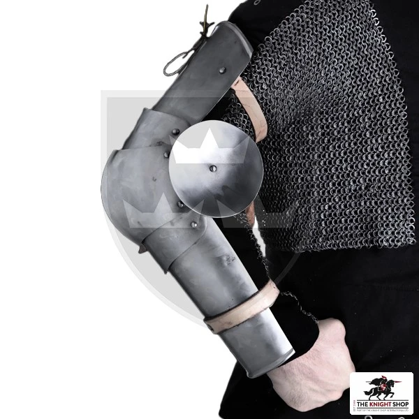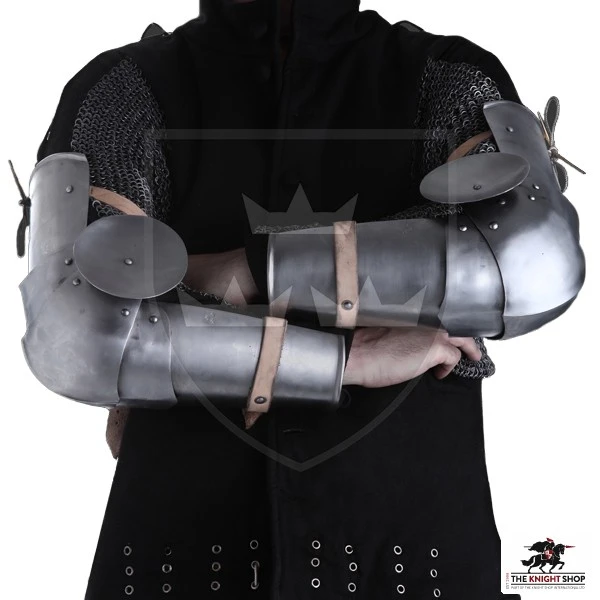 Arm protection, such as those replicated here, could be found in the early 15th century in the “Transitional Period” of armours. Based on several funerary brasses, the style of these arms with round wings can be seen combined with chainmail and mittens at the beginning of the century. This versatile protection can be combined with several pieces to offer an extremely wide range of armour combinations. It is crafted from 16 gauge steel making it great for re-enactment and is fastened by buckled leather straps.Â