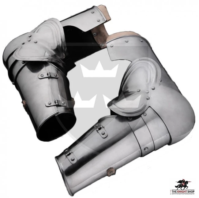 During the 15th century, arm armour evolved from reinforced leather armour into contoured plate armour that fully enclosed the arms and elbows. This offered much better protection at the cost of a little less mobility. Our 15th century arm armour is crafted from 16 gauge steel making it great for re-enactment and is fastened by buckled leather straps.Â