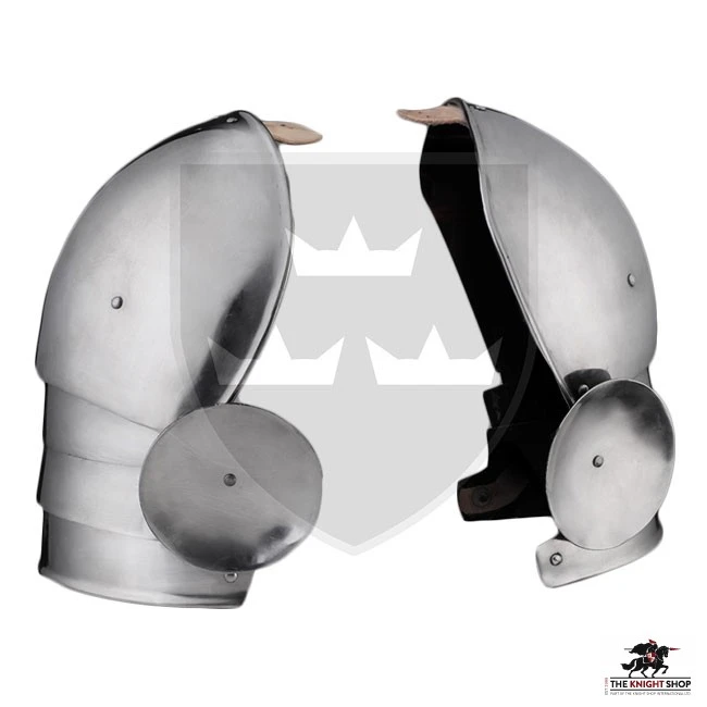 This shoulder armour is suitable for end of 14th to the middle of 15th century. Â It comes complete with besagews to protect the armpits. Â It is manufactured with a leather strap with arming points (holes) to lace it on your arming coat or chainmail.