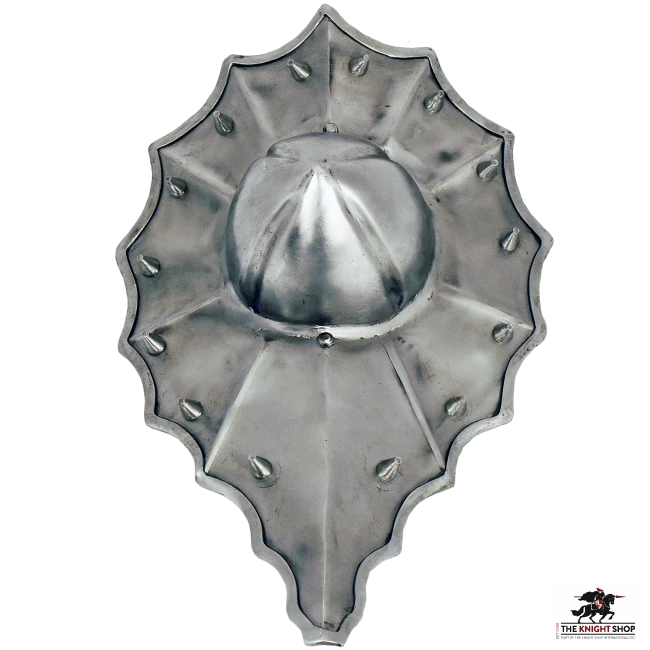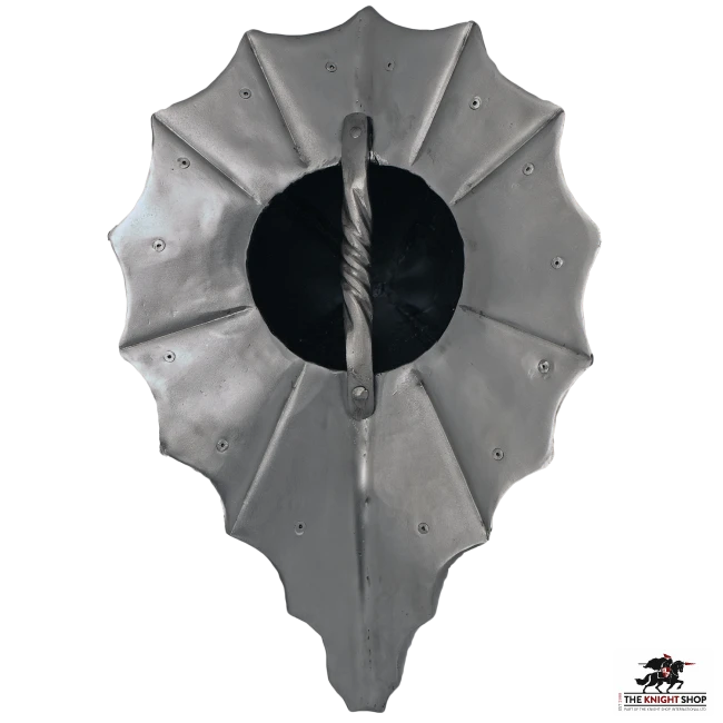 The “Talhoffer” buckler is well known from Talhoffer’s “Fechtbuch” illustrations. The unusual curled holly-leaf shape, with its fluting and spikes, is a fairly radical departure from the norm but it serves well as a memento of this famous fight master.