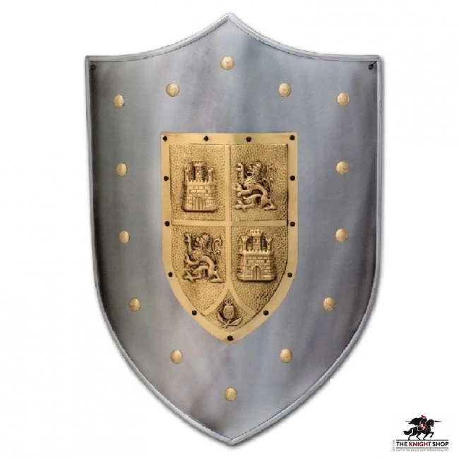 The lion design is attributed to Alfonso VII, who became king of Castile and León in 1126. The castle symbol is attributed to his grandson Alfonso VIII. In 1230, Ferdinand III united the two kingdoms and quartered the arms as a symbol of the union. The triangular shield, known as a kite shield, is double reinforced steel with triple reinforced corners. Beautifully embellished detailing of riveted Golden fittings frame a natural steel finish and adds to the stunning contrast which makes this shield so exquisite.