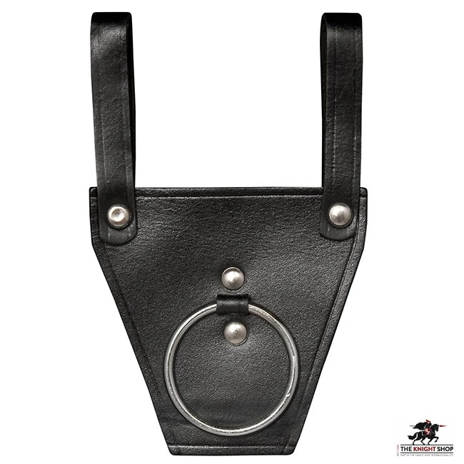 Every sword needs a sword frog, and every axe an axe frog. This black leather axe frog has been designed to fit most belts – it works by pulling the belt through the loops riveted onto the axe frog. Push your axe through the large, nickel-plated ring to keep it handy during battle and your hands-free when you don’t need it. By the way, our leather axe frog is also an ideal holder for war hammers.