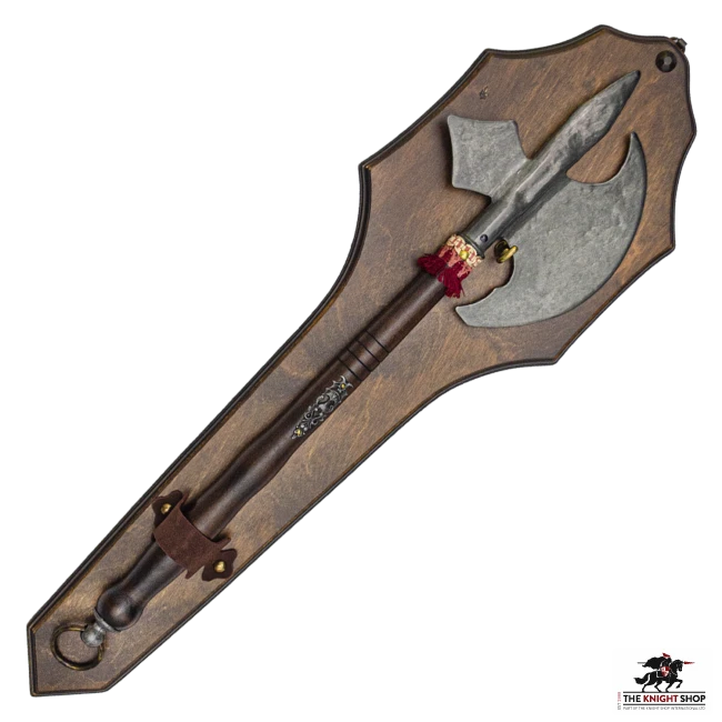 Add a little chivalric grandeur to your home or office with our Battle Axe on Display Plaque. The Battle Axe features a blunt metal blade and wooden shaft and is mounted on a wooden display plaque with a hanging loop at the top. This axe is designed for display only.