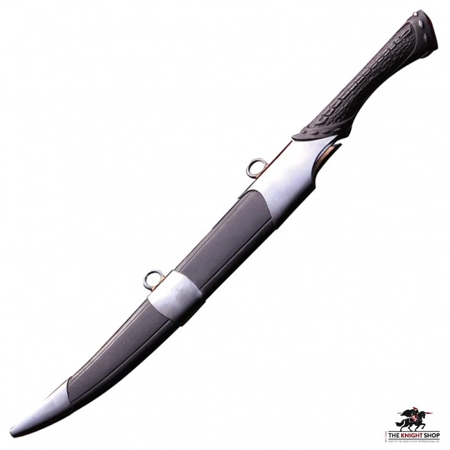 This fantasy knife has a blackened blade, cast metal hilt and, metal and leather scabbard.