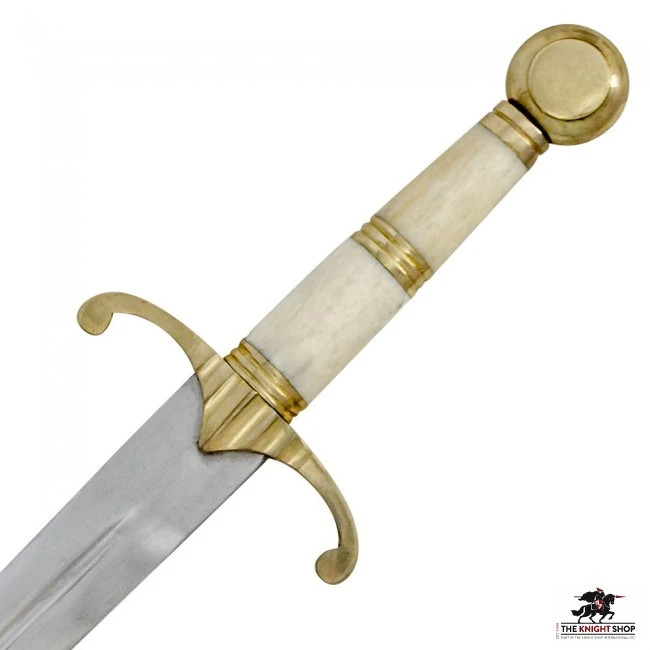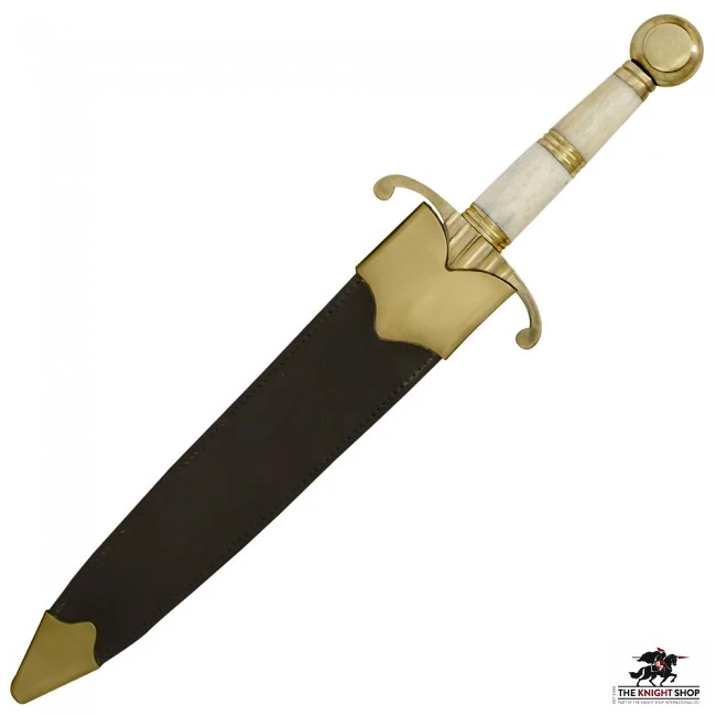 This Blackfriars Dagger is inspired by a sword that was found in the mudbanks of the River Thames near Bull Wharf, Blackfriars. The sword is dated to around 1340-50 and is a typical knight’s sword of the period. It is now held in the Royal Armouries collection. Our Blackfriars Dagger has solid brass hilt fittings and a polished (camel) bone grip.