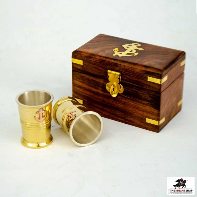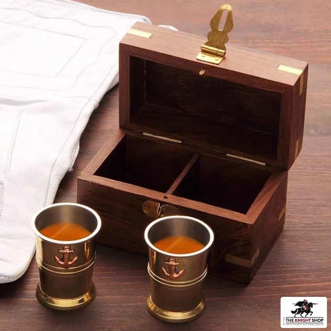 Includes a beautiful hardwood storage box with brass accents. Each cup is sized similar to a shot glass.