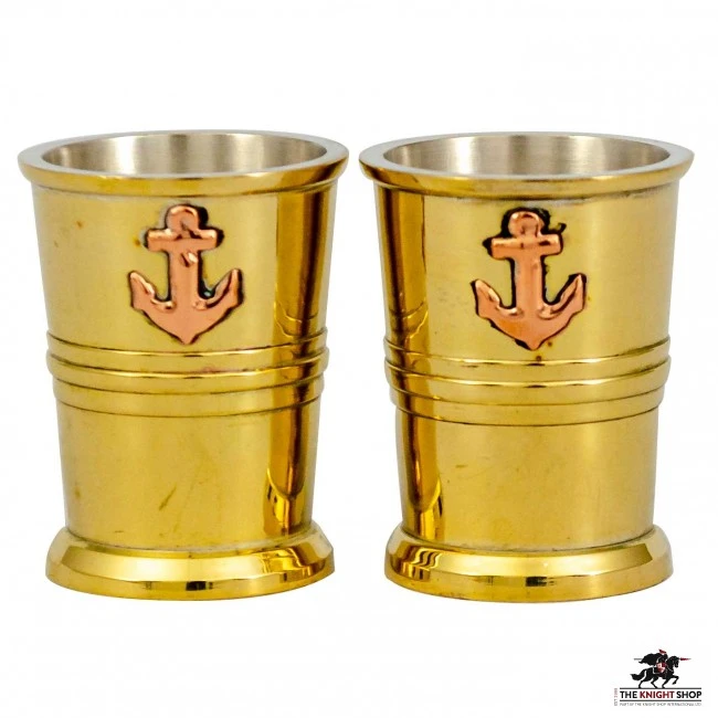 Salute your next voyage with this elegant set of 2 sailor’s cups. Made of spun brass and plated in silver, they’re safe for your next rum toast! Brazed onto each cup is a copper anchor for added nautical flare.