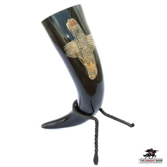 This large styled drinking horn features a detailed Celtic cross pattern.