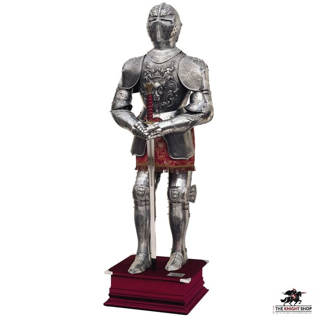 This piece is inspired by the 16th century suits of armour that belonged to Charles V and Phillip II of Spain that are on display in the Royal Armoury Museum, Madrid. It is crafted in polished steel with deeply etched scrollwork patterns. The helmet, breastplate, shoulders and knees are decorated with Bas-relief carvings. It features leather straps, decorative fabric skirt and comes assembled on a wooden display stand on a varnished wooden base. It comes complete with a Charles V sword modelled on an original now preserved in the Armeria Real, Madrid.