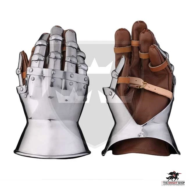 Our Churburg Gauntlets are a replica of some in Churburg Castle which are dated to 14th Century Italy. They are crafted from 16 gauge steel making them great for re-enactment and feature stitched leather gloves and buckled leather straps.Â