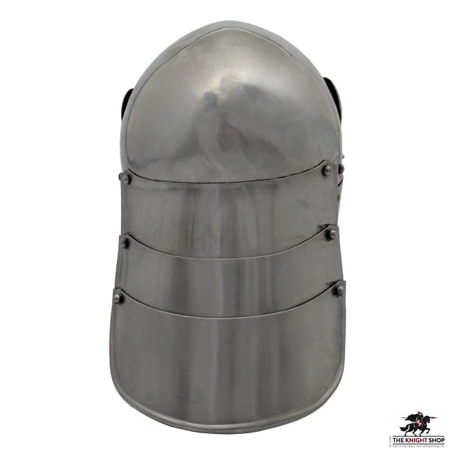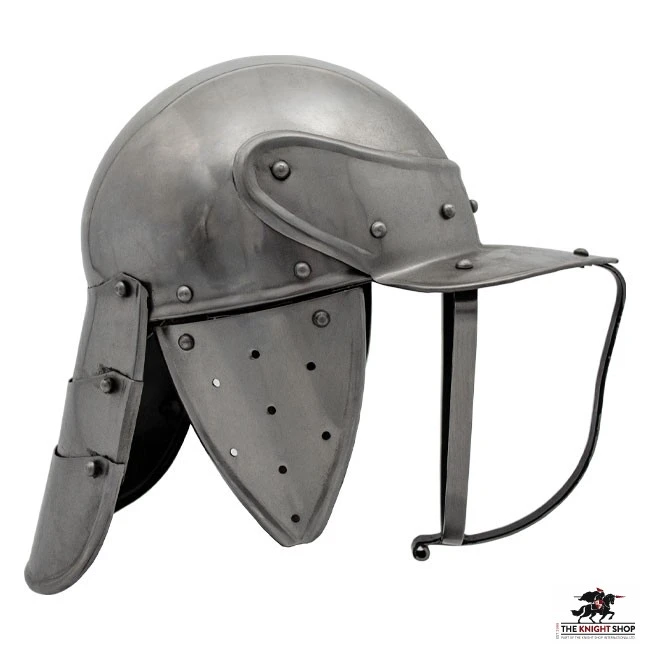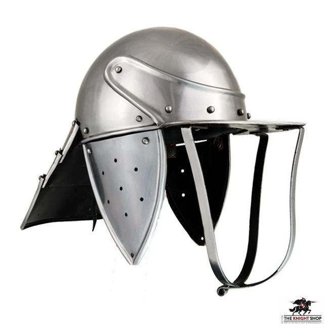 Our Civil War ‘Lobster Pot’ Helmet is hand crafted from polished steel and features an articulated tail to protect the neck, hinged cheek pieces and a tilting visor with 3 bars to protect the face from sword slashes. It is constructed from 18 gauge steel and is great for theatrical use or display. Comes complete with separate padded lining cap that can be glued in if required.