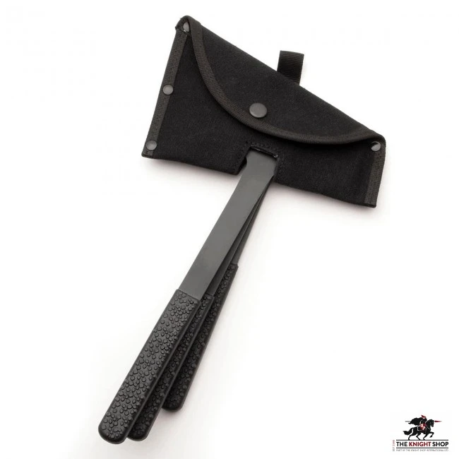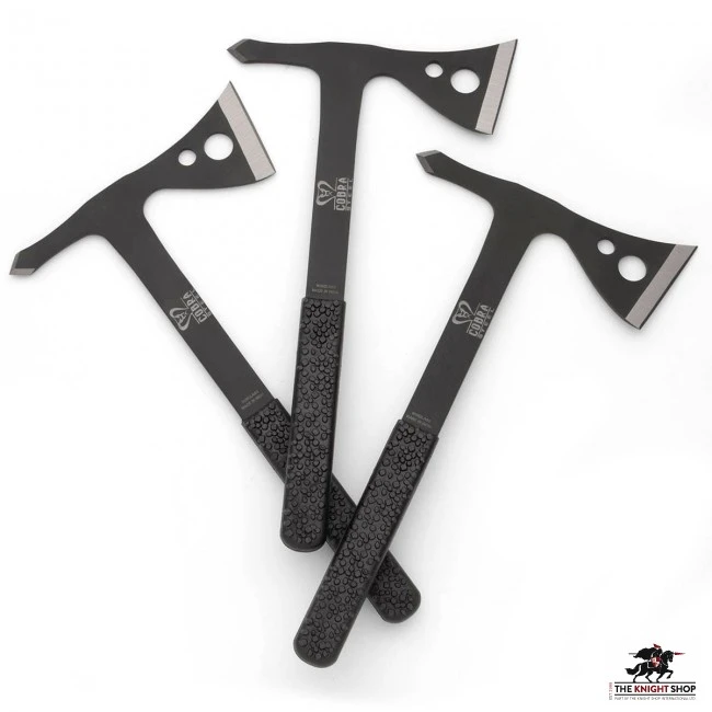 Strike fast and accurately with this set of 3 lightweight throwing axes loosely based on military tactical tomahawks. The sharpened backspike doubles your chances of getting a solid “stick” every time you let one of these rascals loose. Includes fabric belt sheath.