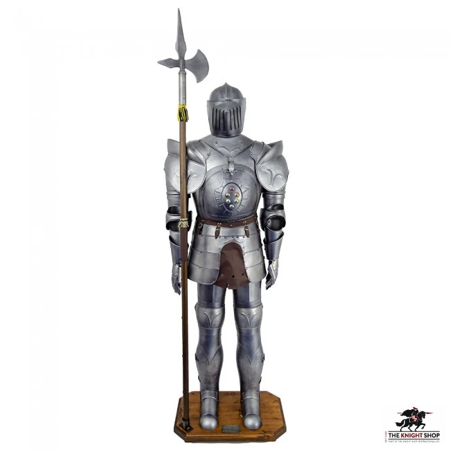 This armour is hand crafted from aluminium with an ink burnished finish and comes complete with steel display stand with wooden base and display halberd.Â