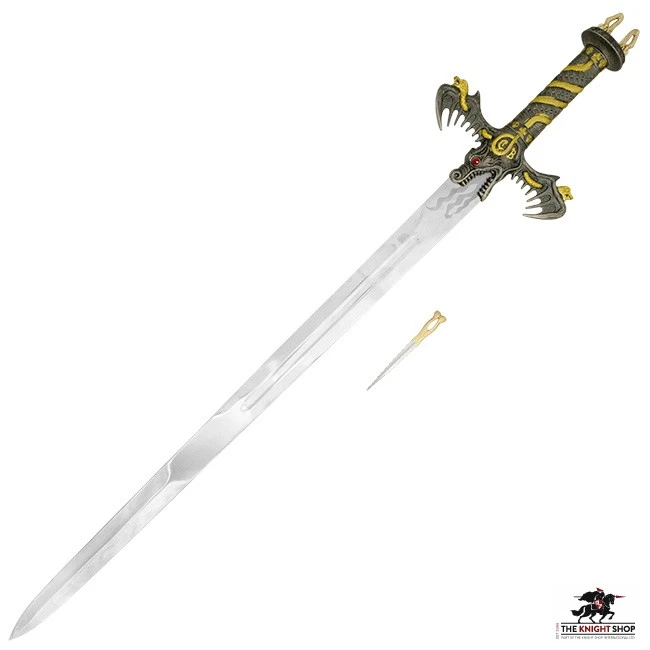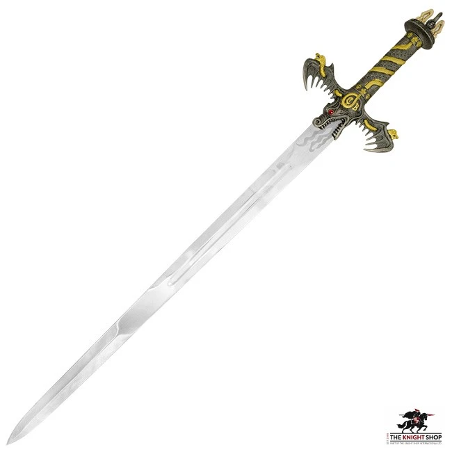 Our Conan the Barbarian sword is a product of the world famous Art Gladius factory in the historic sword manufacturing city of Toledo, Spain. It features a dragon shaped guard with winged quillons and the letters C and B at the centre. There is a hidden stiletto dagger in the hilt and flames etched into the ricasso of the blunt stainless steel blade. This impressive sword is perfect for any would-be barbarian!
