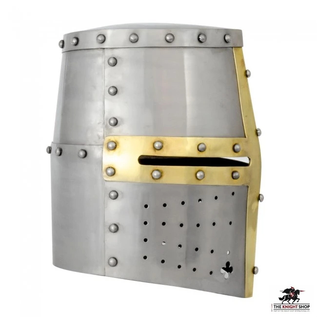 The Great Helm evolved out of a need for greater protection for the head and neck and was first seen towards the end of the 12th century. It was a very popular style of helmet worn by knights and men-at-arms in most European armies and was also worn by knights of the crusading orders such as the Knights Templar. It offered superior protection to the open face nasal helmet of the previous century but restricted vision and could become hot and stuffy – especially on crusade. This is an earlier form of the Great Helm, the shape becoming more conical in later decades.