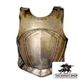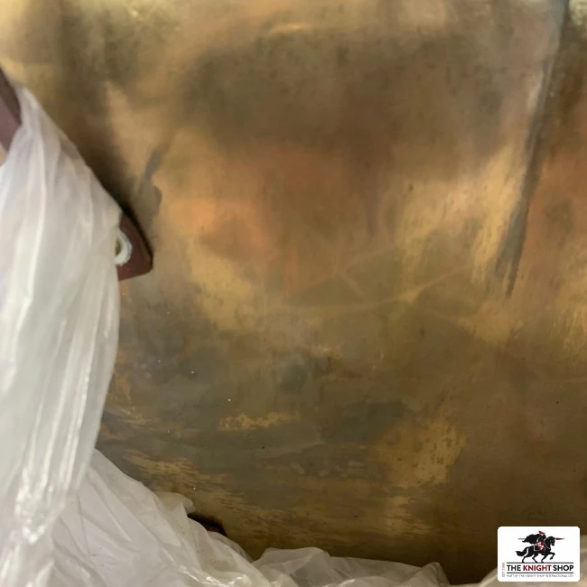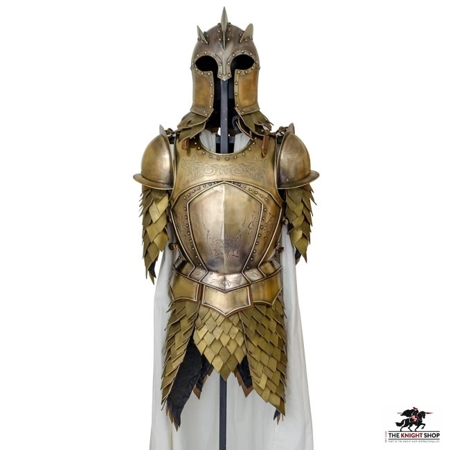 This seriously impressive armour is hand crafted from 18 gauge steel with an antiqued brass finish and is heavily adorned by intricate detailing. It features overlapping leather scale armour on the neck, arms and legs and adjustable leather straps and buckles. The dominating helmet comes complete with a padded cotton lining cap that can be glued in for comfort should you wish to wear it. The armour comes with a white cotton cape to complete the look and also includes a black steel stand for displaying (showing off) your armour when it is not being worn.