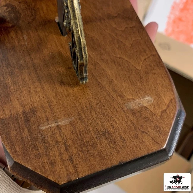 This product has been handcrafted in Italy and is constructed from varnished wood with an antiqued metal sword hilt and tip.