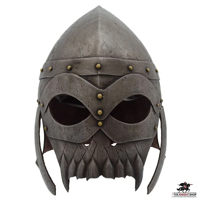 Pitted and showing evil fangs, our Dark Warrior helmet will make any face seem frightening. Even the most fearless warriors will shake with fear when faced with this grim opponent on the battlefield. Our Black Warrior helmet also provides a high level of protection because it is made of thick 16 gauge steel. A liner of rough-out leather on the inside allows you to adjust this dark helmet to fit your head perfectly and also provides lots of wearing comfort. Regardless of the circumstances, a chinstrap keeps the Black Warrior helmet firmly on your head.
