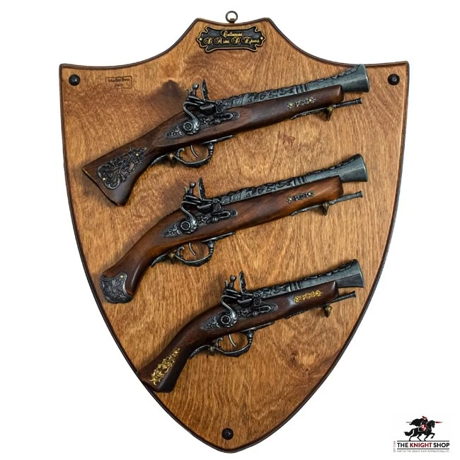 Our Pistol/Dagger Display Plaques are the perfect way to display your flintlock pistols, historical firearms and daggers. They are hand made in Italy and are crafted from wood with a varnished finish. They feature a small brass plaque with the words “Collezioni D’ Arme D’ Epoca” translating to “Collection of Historical Weapons”. This plaque is held in place by 2 small pins and can be easily removed if necessary. The antiqued brass hooks are supplied with fixing pins and can be positioned anywhere on the plaque – allowing for a multitude of different shaped and sized weapons.