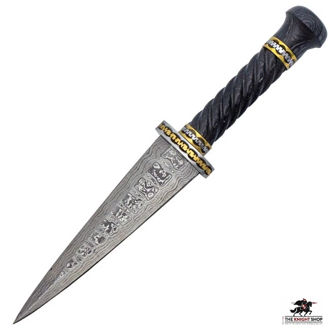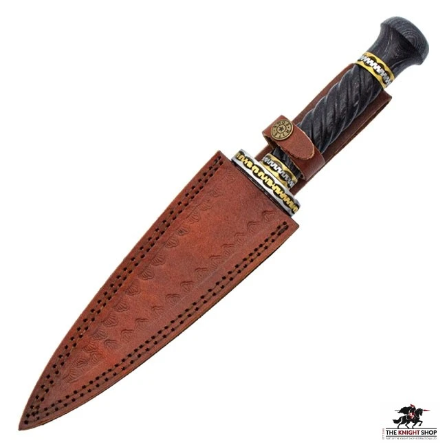 Named after the deadly dragon Vermithrax, this sinister dagger will drive away any foe. The wide, sharp blade of Damascus has a triangular bevel, giving you strength where you need it. The handle is made of gray Pakkawood and has a spiral design for a secure grip. The pommel and guard are decorated with steel and brass bands with an ornate design that makes this dagger a true beauty.