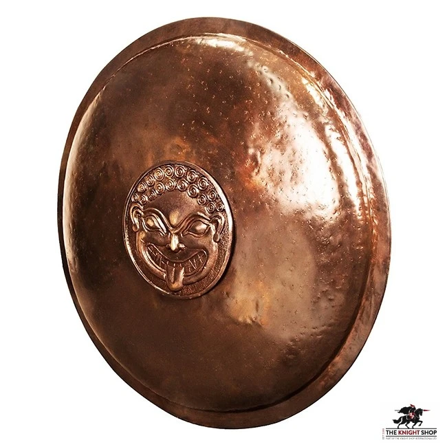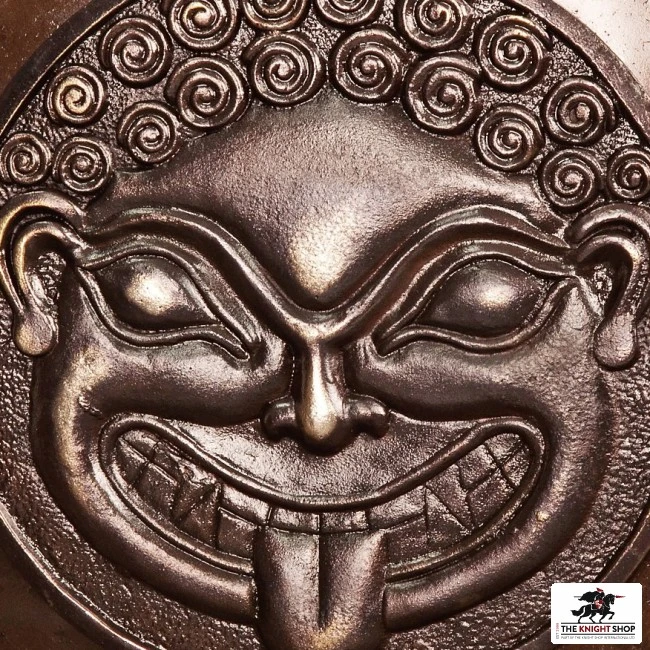 From 300: Rise of an Empire, the Shield of Calisto has an 18 gauge steel construction with an antique bronze finish. The embossed face of Medusa is at the shield’s centre.