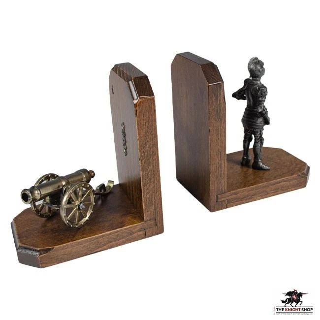 Pair of bookends in shaped wood. One terminal features a miniature cannon made of burnished cast metal, while the other features a pewter figurine depicting a 16th-century knight in armor.