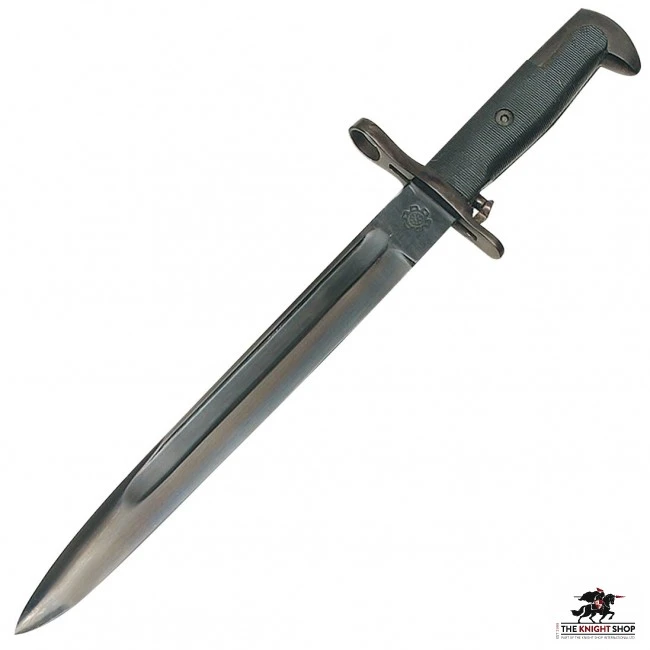 M1 Garand rifle was first issued with M1905 16″ bayonet. In 1942, the US Military determined that a shorter bayonet was more useful. Existing stocks of M1905 bayonets were cut down to 10″. In addition, new manufacture 10″ bayonets were also produced. Cut-off-bayonets have fuller that extends to the point and new manufacture has fullers that stop about 3″ from the point. This reproduction bayonet is made to original specifications from high carbon blued steel with hard plastic grips. Made by Windlass Steelcrafts. Scabbard available separately.