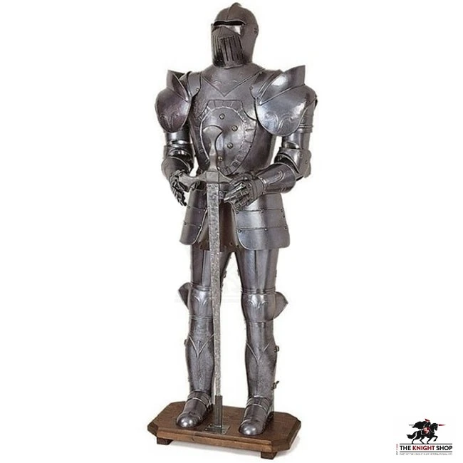 This armour is hand crafted from aluminium and features an ink burnished finish. It comes complete with steel display stand with wooden base and display sword.
