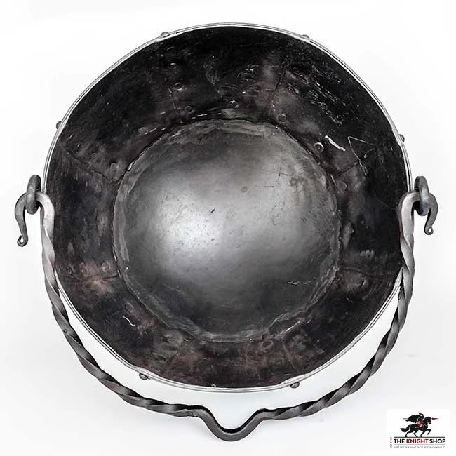 This large Medieval cooking pot is constructed from riveted cast iron plates reinforced with welds at the seams. It is suitable for open flame cooking or boiling water. Its cast iron construction makes it heavy and heat conductive. With its Medieval design, this pot is perfect for re-enactment. The twisted bar handle is fitted to the kettle with hooks through iron loops. The articulated handle makes it possible to suspend it over a fire or hang when not in use and can be folded down for easier transport.