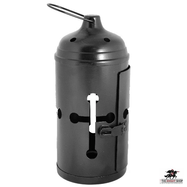 Our Medieval Lantern is crafted from blackened steel and features a ring on the top for attachment to a carrying stick. It has a hinged door and is designed for use with a candle.