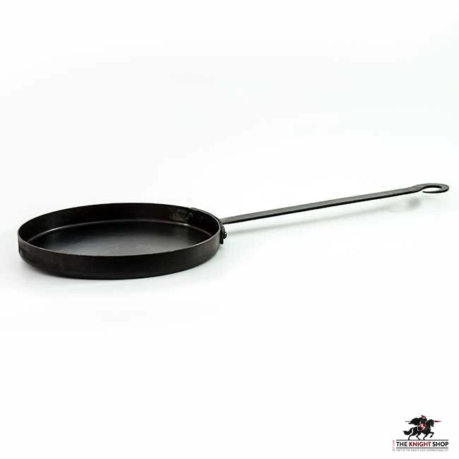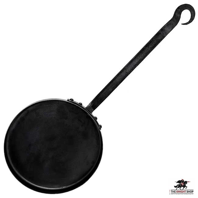 This Medieval Skillet is hand forged from iron with both riveted and welded construction. Stout and sturdy, this long-handled skillet is ready for your medieval kitchen or campsite. The skillet has a round bottom with flat edges and a conveniently long handle, which maintains a safe distance while cooking. The handle has a hook at the end for hanging it while not in use.