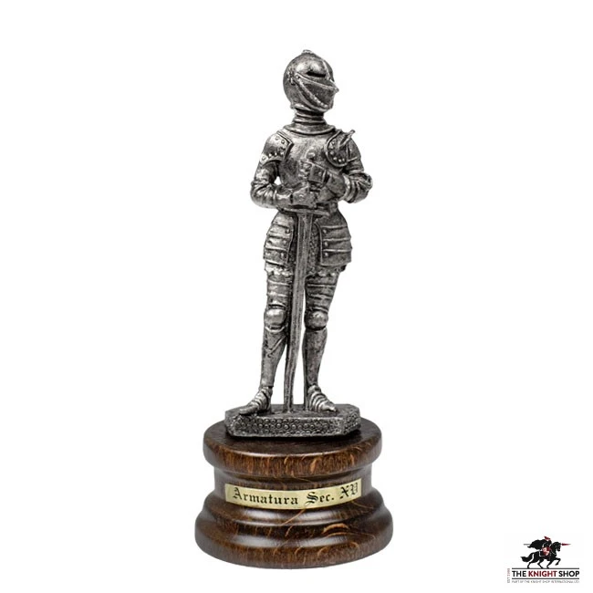 A wonderful depiction of a 15th century knight wearing German armour, the Mini Pewter Knight with Sword is a marvelous piece of medieval decor to display your fascination with the armour and warfare of the Middle Ages. The Germanic origin of this armour style can be easily seen through the gratuitous use of reinforcing patches throughout the plated design. Clutched in the hands of the knight is a Milanese broadsword, which spans the distance from chest to foot to achieve a look of severe power. Pewter is used for the construction of this figurine, allowing for the exhibition of superb detailing. A lustrous brown wooden stand acts a grand platform on which this knight is displayed.