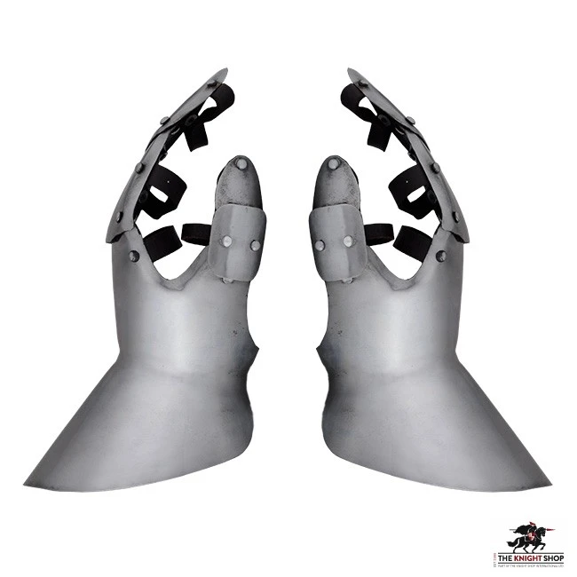 Our Mitten Gauntlets are part of an Arming Jacket/ Jack Chains/Sallet/Gauntlets/Glaive set reproduced from museum originals. They are crafted in 16 gauge steel, making them great for re-enactment, and provided with hand straps, and are intended to be worn over gloved or mittened hands.