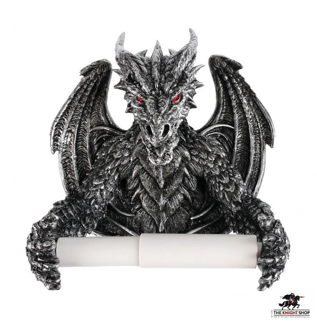 The pewter-coloured beast sits as if protecting his hoard. His head facing straight ahead with bright red eyes staring forwards. His arms, covered in intricate scales, form the holders for the cylindrical paper holder. His large wings are spread behind him creating the perfect back piece.