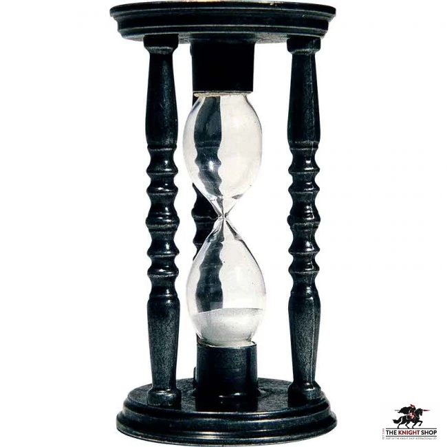 Emulating the designs of hourglasses used during the medieval era, this replica features broad circular bases and three support columns. Each of these columns is beautifully designed with grooved patterns along the center. The glass chamber is crafted in a single piece and is delightfully shaped like two eggs conjoined at their narrow ends. White-colored sand is contained within this glass chamber, which contrasts with the sleek black finish of the frame.