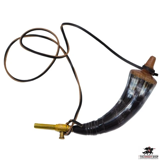 The use of the Powder Horn goes back to the Middle Ages where they were used to carry gunpowder for early firearms. As firearms became more common during the Renaissance and later periods, so too did the use of the powder horn. They were mainly used for pistols and muskets but would also be used for the priming of large naval guns. The use of animal horn along with nonferrous metal parts ensured that the powder would not be detonated during storage and loading. It was not unknown for soldiers to polish the inside and outside of the horn to make them translucent enough to see how much powder they had left. Powder Horns were usually filled from the top and dispensed powder from the narrow point.