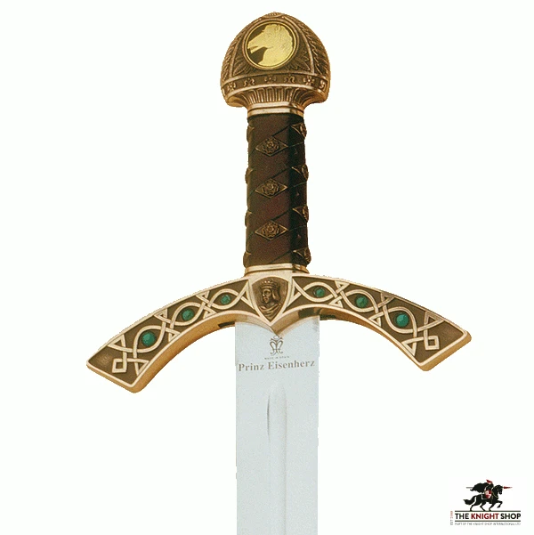The Prince Valiant Sword features an intricately detailed bronze plated hilt that features the Prince’s shielded likeness adorned with six green simulated gemstones rested among beautiful Celtic knotwork. A plated horse head pommel tops this piece of legendary art. The tempered steel blade of the Prince Valiant Sword features a fuller (blood groove) on each side.