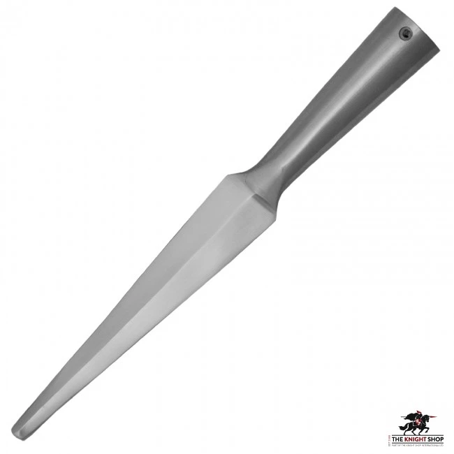 Our Reenactment Medium Bladed Spearhead is made specifically for re-enactment use. This spearhead is crafted with a bulbous tip and has blunt 2 mm thick edges. If using for reenactment, we advise checking specifications with your safety officer before purchase.