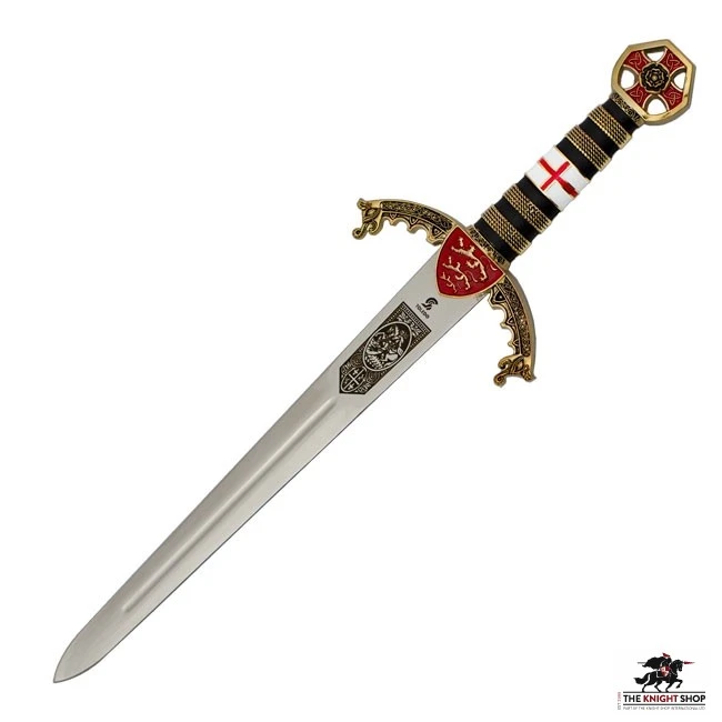 Our Richard the Lionheart Dagger is manufactured in the world-famous Art Gladius factory in Toledo, Spain. Its ornate hilt is adorned with the three lions crest of Richard the Lionheart. The broad stainless steel blade has a fuller and is etched with heraldic devices.