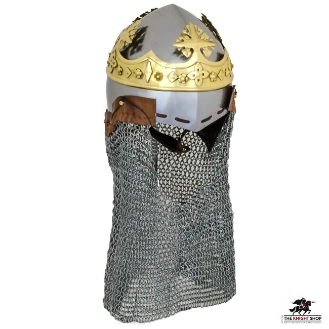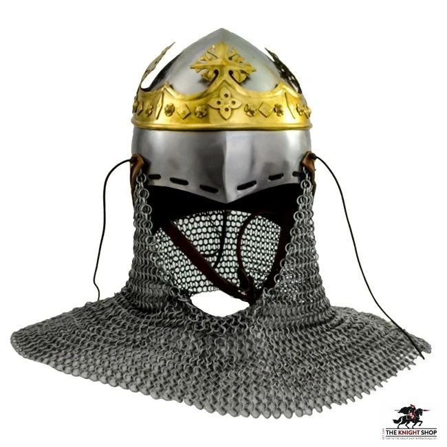 Our Robert the Bruce Helmet is a replica of the bascinet worn by the Robert the Bruce on his famous statue at the Bannockburn battlefield site. It is an accurate replica of a helmet from this period and features a chainmail aventail to protect the neck and is mounted with a brass crown. This helmet is handcrafted in 18 gauge steel. Not recommended for contact re-enactment.