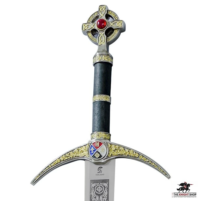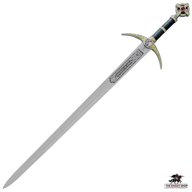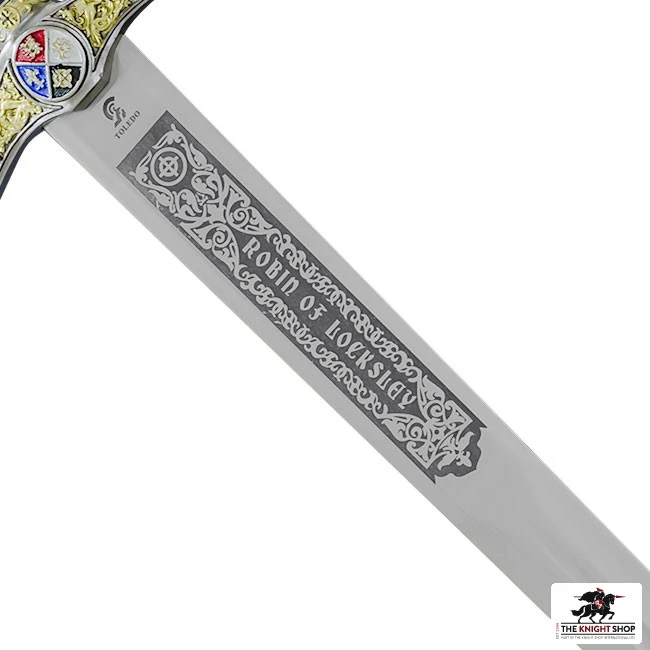 Robin Hood (Robyn Hode in earlier manuscripts) was a heroic outlaw from English folklore. He is traditionally associated with “robbing from the rich to give to the poor” and was both an excellent archer and swordsman. There are many legends surrounding him, the most popular of which sees him fighting the Sheriff of Nottingham and evil Prince John whilst King Richard was away fighting in the Crusades. The Robin Hood Sword is constructed in the world famous Art Gladius sword factory in Toledo, Spain. Toledo has a reputation for producing some of the finest swords in Europe and has been the centre of sword production for centuries. It is styled on the “Locksley Sword” from the movie Robin Hood – Prince of Thieves. The cross shaped pommel is featured on the matching “Robin Hood Dagger” which can also be found on our site. The stainless steel blade is etched with heraldic patterns and housed in a decorated leather effect sheath. Matching “Robin Hood Dagger” AG524 available.