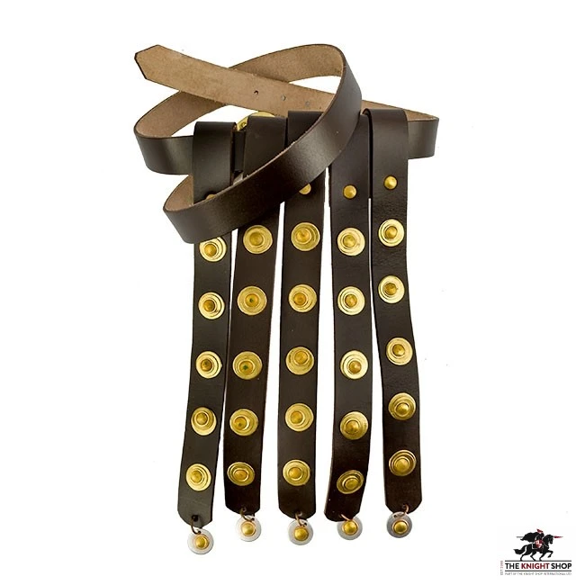 This type of Roman Legionary leather belt (balteus) is characteristic of the cingulum militare worn by many soldiers in the Roman legions. The five strips of leather that hang from the centre to form a protective “skirt” make this Roman belt similar to ones that many legionaries are pictured wearing. The Roman Legionary belt is made of genuine, 3 mm thick leather. Each of the five strips has decorative brass plates riveted onto it, and round steel coins hang on bronze rings from the ends.