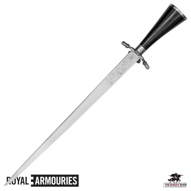 By tradition, the original dagger belonged to Henry VIII and was probably a hunting weapon. Its blade is long, hollow-ground, single-edged and decorated with etched roses and pomegranates.
