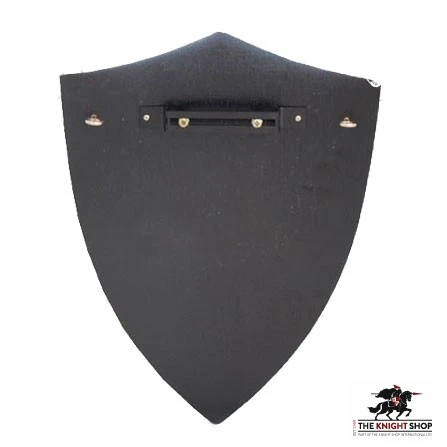It is crafted from wood and hand-painted with brass embellishments. It features hanging loops on the back and a device for clamping your sword securely in place.
