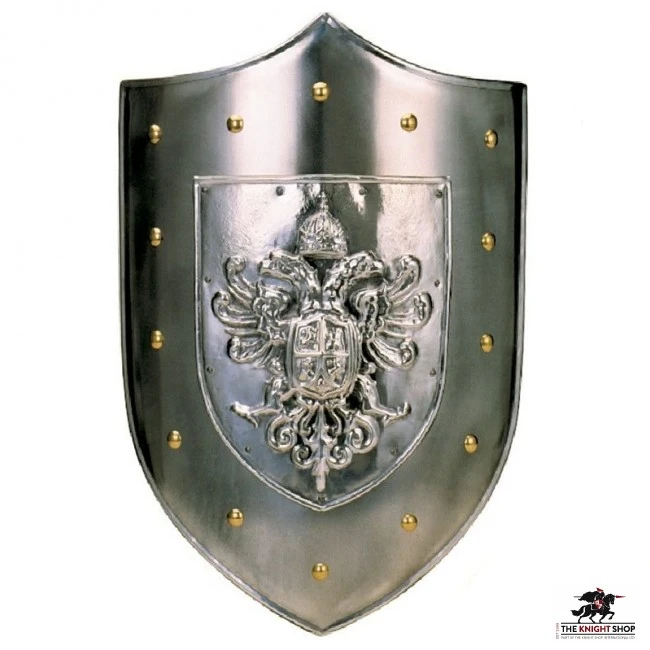 Exquisitely handcrafted in stainless steel with a polished finish. At the shields center is a depiction of a double-headed eagle crest that makes an interesting textured relief against the smooth polished surface of the backplate. It is surrounded by embellished golden studded detailing which adds to the classic and clean design of this shield. The triangular shield, known as a kite shield, is double reinforced steel with triple reinforced corners. Beautifully rich detailing of golden steel fittings enhancing a natural steel finish.