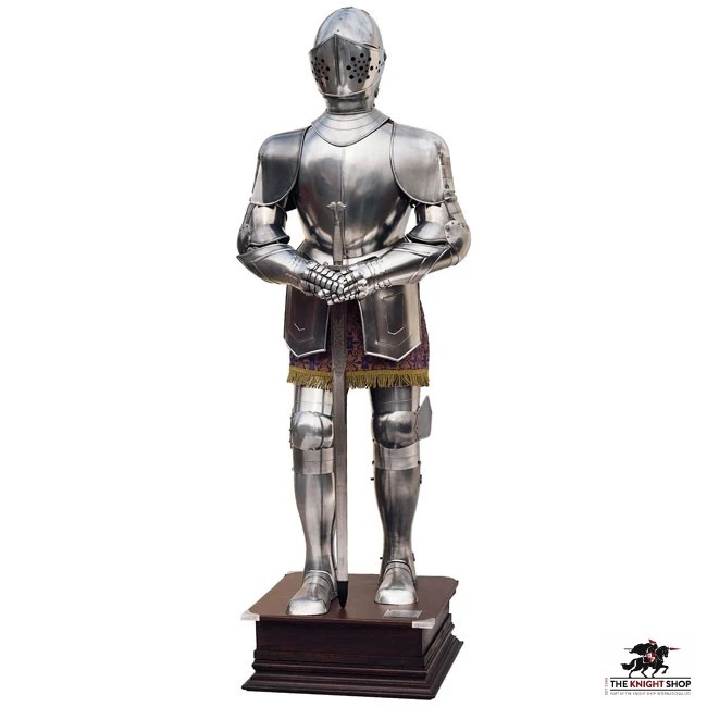 This piece is inspired by the 16th century suits of armour that belonged to Charles V and Phillip II of Spain that are on display in the Royal Armoury Museum, Madrid. It is crafted in polished steel and features leather straps, decorative fabric skirt and comes assembled on a wooden display stand on a varnished wooden base. It comes complete with a Charles V sword modelled on an original now preserved in the Armeria Real, Madrid.