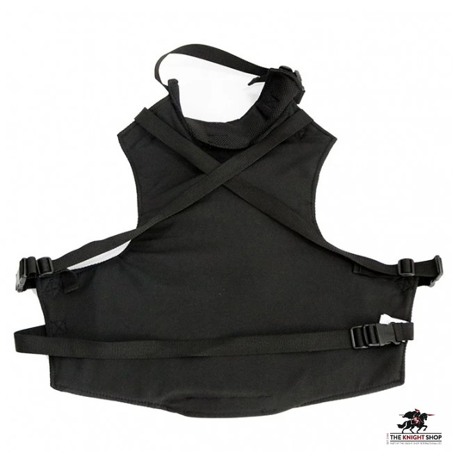This model is made from black fabric. It has a high collar and rounded bottom edge. This plastron is fastened on the back with 4 buckles.
