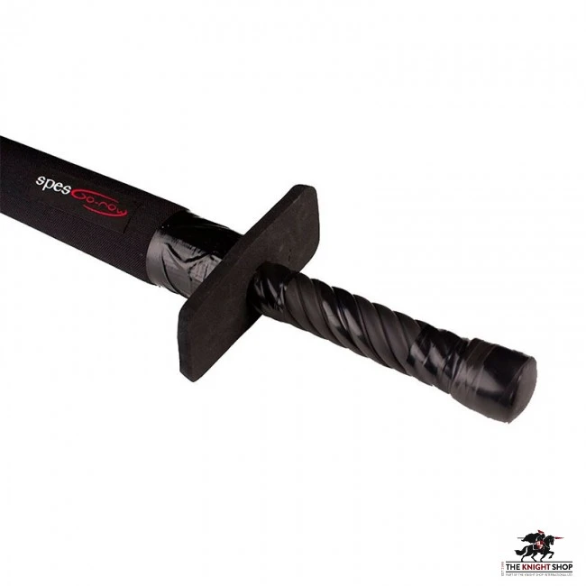 It is a one-handed sword made of black, durable materials. The blade is smooth and the handle is twisted. The styrogum crossguard is simple and stable.