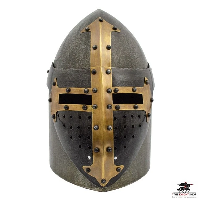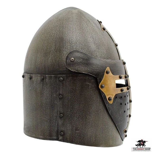 The Sugar Loaf helmet, so called because of its similarity in shape to the traditional “Sugar Loaves” that sugar was traditionally sold in, was a later variant of the Great Helm and was used throughout the 13th and 14th Centuries. This style of helmet saw use in many famous battles of the period and was also worn by Crusaders. The domed top was much better at deflecting blows than the flat topped Great Helms.