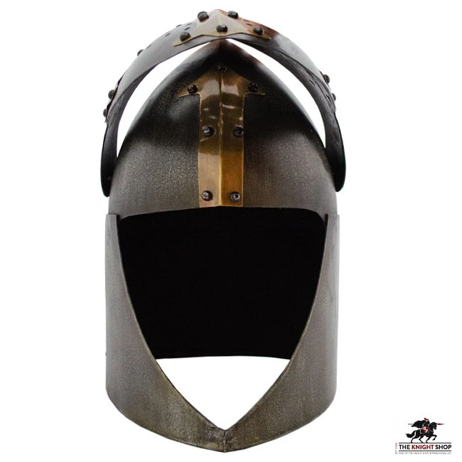 Our Sugar Loaf Helmet with Visor is hand crafted from 18 gauge steel with a painted antique finish and decorated with a brass cross. The hinged visor can be raised to allow for extra vision and ventilation at the cost of protection. Comes complete with separate padding lining cap that can be glued in if required. Not recommended for contact re-enactment.Â